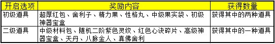 温馨提示:宝箱每次开启,一定会获得初级道具列表中的两种,并且一定会获得二级道具中的一种