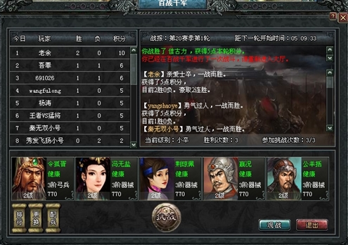 参与方式在活动期间内,所有参与百战千军的玩家进入自己所在级别的大厅,选择参战武将报名参战,系统将随机安排一名同级别的玩家与之对战。活动的第一赛季开始于开服后的第一个周一(如果周一开服则顺延至下周一),玩家首次获得的军衔取决于玩家的君主等级排序,也就是说赛季开始时玩家的等级越高,那么获得军衔越高。