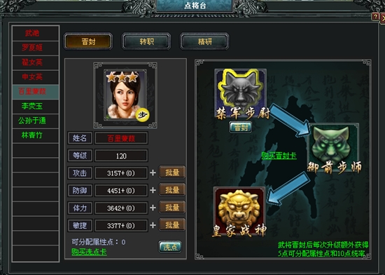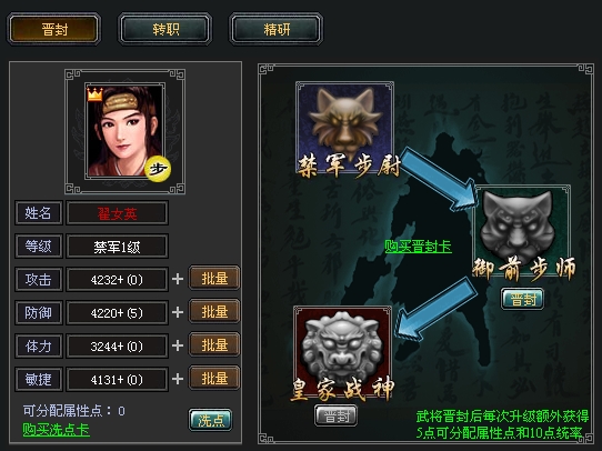 小提示: ① 洗点只能洗去自己手动分配的属性点,不能洗掉基础属性; ② 每个武将最多可进行3次晋封; ③ 如果晋封后的武将属性点加错,可以通过武将洗点卡使其升级所获得自由属性点归零,可以自由分配。 |