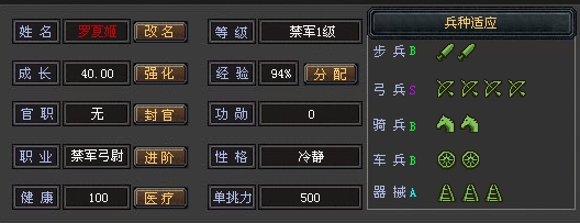 ① 晋封之后,武将等级变为禁军1级,可以继续升级,每升1级,增加5点属性点,可以自行分配,增加10点武将统率; ② 武将晋封前四维属性不变,成长不变; ③ 晋封后所有兵种适应性加1,因此战斗力会得到显著提升; ④ 晋封后部队战斗力能得到大幅度提升。