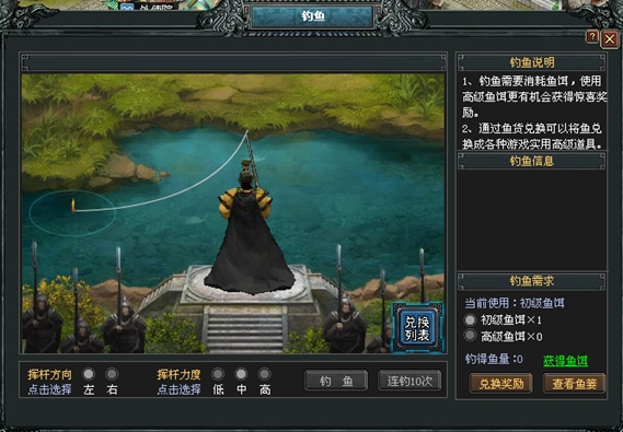 在进入入口后,便出现了钓鱼界面,玩家需要鱼饵进行垂钓,钓上来之后的鱼可以兑换大量的游戏道具;玩家可点击选择控制挥杆的角度和力度大小,鼠标点击相应的单选按钮即可调整。 ① 挥杆方向:表示挥杆时鱼漂的落点,有左和右两个方向; ② 挥杆力度:表示挥杆时的力度大小,力度越大,鱼漂离河岸越远,分为有低、中、高三种选项。打开钓鱼界面时,默认挥杆方向为左,挥杆力度为中; ③ 钓鱼按钮:点击钓鱼按钮即可进行钓鱼,每钓1次鱼需要消耗1个鱼饵; ④ 连钓10次:点击连钓十次按钮可以一次性钓十次鱼,即播放一次动画,钓得10次鱼。