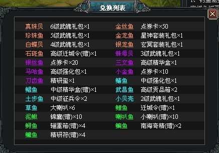 玩家在选择了鱼饵之后点击 小提示:兑换的游戏道具直接放入到背包里; 钓鱼的规则① 不同的鱼饵影响钓得高级鱼的几率; ② 使用鱼饵的时候优先使用赠品; ③ 钓鱼消耗鱼饵,每次钓鱼消耗一个鱼饵。 奖励兑换列表