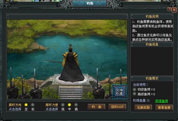 古有姜子牙垂钓,愿者上勾,现有七雄列强垂钓修身养性。玩家可以在自己的鱼塘里钓鱼,使用鱼饵钓鱼后会得到鱼货,通过鱼货兑换可以换成各种游戏实用的高级道具。 钓鱼入口在主城官府的右边点击鱼塘可进入“钓鱼”系统进行垂钓。