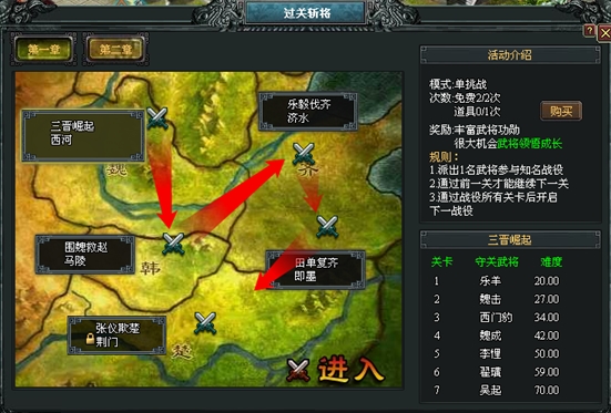 活动注意项① 玩家首次进入过关斩将活动,必须从三晋崛起开始,玩家进入战役后,选定出战武将参与知名战役,战胜所有NPC武将后才能开启下次战役。第二章的战役需要玩家全部通过第一章战役后方可参加。