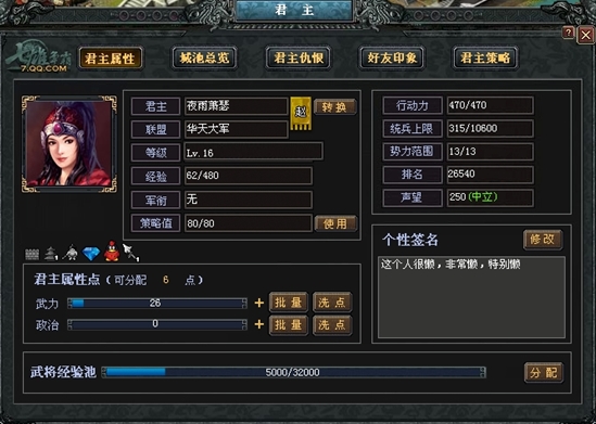 君主属性点君主共有武力、**二种属性点,分别对各项属性有加成作用。君主每升1级增加2点待分配属性点。特区中心建筑也能增加君主相应属性(封邑-司徒署可增加**,军政-司马署可增加武力)。 武力① 君主麾下武将四围基础属性百分比增加――每1点武力值为增加武将四围基础属性将增加1%; ② 君主的带兵上限增加――每1点武力可以增加100个带兵上限; **① 每1点**增加武将经验池上限1000; ② 每1点**增加资源产量1%; ③ 每1点**增加建筑建造速度2%; ④ 每1点**增加城防建造速度1% 。 武将经验池可以将武将经验池中的武将经验分配给麾下武将,而经验池的经验可以通过一下几种方式获得: ① 联盟日常奖励:拥有联盟的玩家每日能在联盟福利处领取日常奖励(需消耗一定的联盟贡献值),其中包含一定量的武将经验,领取后经验存入经验池中,经验池经验可以随时分配到各个武将身上,供武将升级; ② 使用经验卡:使用道具经验卡也能获得武将经验存入经验池中; ③ 联盟祈福:在联盟建筑社稷宗庙中祈福有可能获得武将经验; ④ 天命合璧:成功参与天命合璧活动后能获得武将经验; ⑤ 祭坛资源兑换:在封邑分城的祭坛中每日可使用资源兑换一定数量的武将经验。 国家转换国家转换可以让玩家改变自己的国家,需要消耗100元宝,当玩家处于新手期时,可以免费转换1次国家。