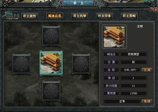 君主介绍君主系统是《七雄争霸》一个重要的养成系统,君主的养成是一个长期持续的养成系统。点击左上角的君主头像或正下方的“君主”按钮可进入君主系统。 君主系统包括:君主属性、城池总览、君主仇恨、好友印象、君主策略。 君主属性