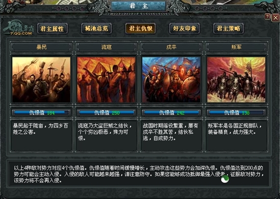 君主仇恨的形成见上图文字描述,当抵御住最强的敌对势力进攻后,则征服此势力。 好友印象