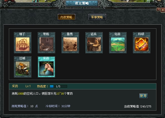 每种策略使用的次数越多,等级越高,使用后的效果越显著。 ① 增丁:消耗粮食,增加人口; ② 苛税:消耗人口,增加铜币; ③ 垦荒:消耗铜币,增加繁荣度; ④ 征兵:消耗人口,增加新兵; ⑤ 屯田:消耗新兵,缩短农场作物成熟时间; ⑥ 科研:消耗铜币,缩短科技研究时间; ⑦ 采药:消耗空闲人口,补充医馆膏药。 军事策略