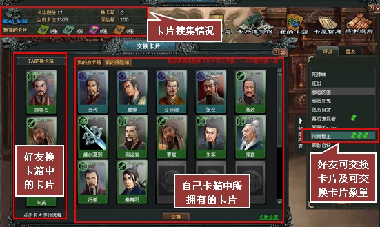 ② 主动交换:通过卡屋右侧的列表里进入好友或者盟友的卡屋先选择好友换卡箱的卡片,再选择自己卡箱的卡片,点击交换即可。注意哦,交换的卡片必须是同品质同类型,一次只可交换一张。