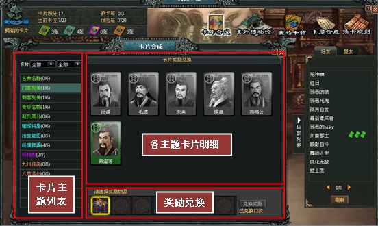 换卡箱中的卡片交换一次后,交换双方获取的卡片会有一个2分钟的锁定时间,此时间内,卡片无法被换走,也可以把卡片放在换卡箱里,等待其他玩家与你换卡。卡片也可以进行买卖,当卡片过多时,可在铁匠铺中贩卖换取铜币。 卡片的合成在“卡片合成”中,可以查看到各主题卡片的搜集情况,若集齐一套卡片,在“卡片合成”中选择相对应的主题,点击页面下方的“兑换奖励”即可。同时每集齐一套卡片会获得集卡积分。收集的卡片品质越高,获得的奖励和积分就越高。