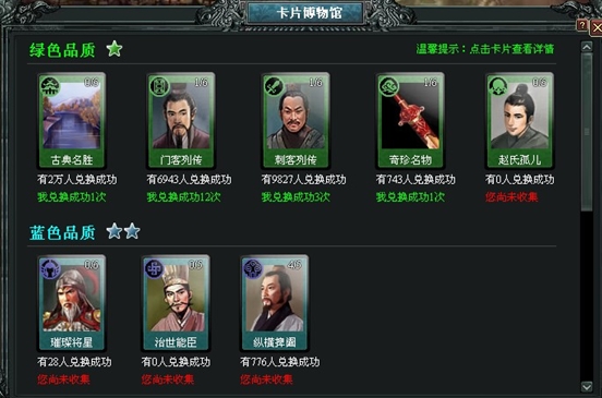 通过游戏中的各个玩法获得卡片,每张卡片都有一套对应的主题,当收集到了一套完整的主题卡片,就可以在自己的卡屋里兑换强力道具了。 玩法介绍卡片的基本属性卡片分为风云人物,名胜古迹 ,历史战役 ,奇珍异宝,传说故事5重类型,并且每类卡片都有5种品质分为绿,蓝,紫,橙,红;品质越高的卡片获得的难度越大。 卡片的获得通过游戏中的过关斩将、天命合璧、砸蛋、抗击匈奴等活动都有机会获得卡片,获得的卡片可以 “我的卡箱”中进行查看,卡箱有容量限制。 备注:进去我的卡箱,点击