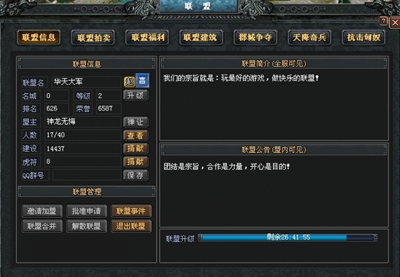 联盟是游戏中最为重要的社交中心,联盟是集体意识行成的表现。创建一个联盟不仅可以使自己的实力得到快速得提高,获得更多的发展空间、资源、科技加成及盟友帮助等,而且可以和盟内成员畅所欲言、共同做战。有助于玩家的快速发展,同时也可参加更多的活动及任务。 联盟界面