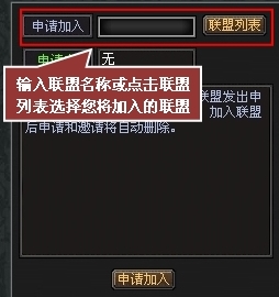 按钮,在加入联盟界面右侧的联盟列表中选择一个联盟加入,也可以也可以输入自己已知的联盟名,最后点击“申请加入”进行申请。当该联盟盟盟主或副盟主通过申请后就完成了加入联盟。