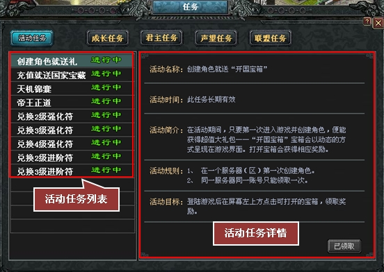 任务是游戏剧情的重要体现,丰富的任务让玩家不仅能够更快的理解游戏,而且能够让玩家在日常的积累中学习到有意思的知识以及某些高难度的任务让玩家更乐于挑战。任务主要包括成长任务、日常任务、声望任务、联盟任务及活动任务。 活动任务在游戏中,不定期会提供各类多种多样的任务活动,极大的丰富了游戏的乐趣。活动任务会随着玩家的在线时长而逐步出现。