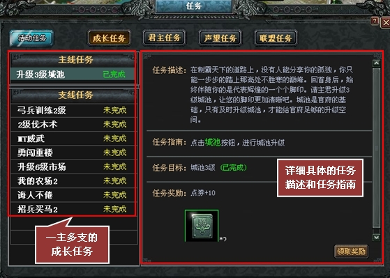 成长任务《七雄争霸》前期准备了丰富多样的成长任务,从筑城池到建民居,从征兵役到种田园。事无巨细一一指引。详细的任务描述,具体的任务指南,循序渐进,由易到难,新手任务一主多支,多种任务可同时进行。让您轻松踏出体验帝王之旅第一步。其主要目的是要玩家一步一步的熟悉游戏、了解游戏。