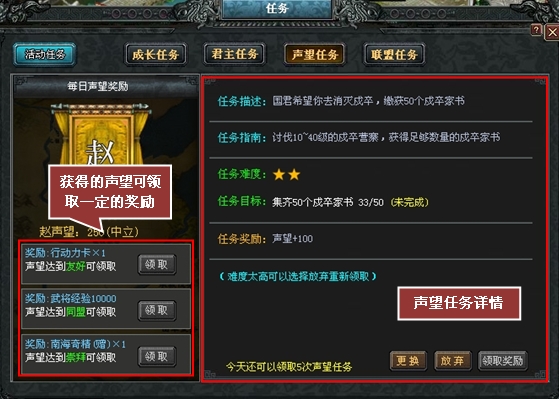 小提示: ① 执行君主任务需要消耗君主行动力; ② 君主行动力每天24点会自动补满,升级君主等级、在商城购买行动力卡可获得行动力,在联盟祈福也有一定几率获得行动力; ③ 君主在同一个时间只能执行一个君主任务。 声望任务声望任务可以帮助玩家提高声望值,同时也会促使玩家挑战更高的难度,声望达到一定程度时,会获得一定的日常奖励。同时可以在声望商店里面换取声望装备。 点击任务进入任务列表后,点击