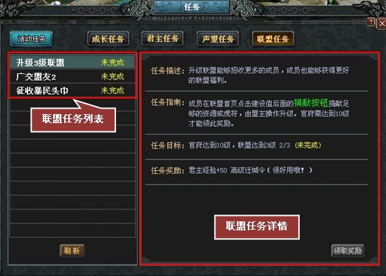 按钮进入联盟任务界面,按照任务描述和任务指南要求完成任务即可领取奖励。完成联盟任务可以获得联盟贡献度或是点券、君主经验等各种任务奖励。