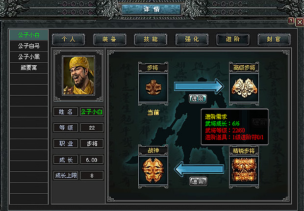 当武将达到以下条件时,可以在 武将―详情―进阶 处进阶。 1)武将级别达到当前的最高等级; 2)武将的成长达到了当前进阶所需标准;