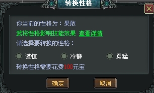 在转换性格时,选择合适的性格后,点击确定即可转换成功,转换成功后武将性格对武将技能的加成也会随之改变。 |
