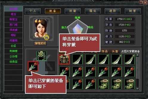 装备是决定武将能力值的重要表现,根据武将的职业、擅长和性格选择适合的高品质装备,会让武将更加强大。 装备的种类及属性七雄争霸的装备分为五类,分别为:武器、头盔、铠甲、护腿和饰品。 装备的属性分为武将防御、武将体力、武将攻击、武将敏捷和武将统率,每一件装备所附加的属性都有所不同。 头盔附加主要属性:武将敏捷、武将体力、武将统率; 武器附加主要属性:武将攻击、武将敏捷、武将统率; 胸甲附加主要属性:武将防御、武将体力、武将统率; 饰品附加主要属性:武将攻击、武将体力或武将敏捷、武将统率; 护腿附加主要属性:武将防御、武将敏捷、武将统率。 装备的品质七雄争霸的装备品质有五类,从低到高分为:白色→绿色→蓝色→紫色→橙色;品质越高,所附加的属性也越高。 穿戴及卸下装备为武将穿戴装备的步骤为:点击武将-详情-装备,选择武将,点击想要穿戴的装备即可。如果想要卸下,点击已穿戴好的装备即可卸下。