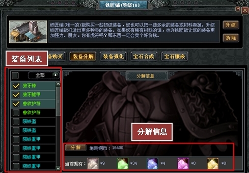 装备获得① 在铁匠铺中花费铜币即可购买得到白色装备和少量绿色装备。 ② 单挑野外势力可以获得绿色装备。 ③ 通过勇闯重楼20层、40层、60层、80层和100层可以相应获得蓝色、紫色和橙色装备。 ④ 通过声望购买可获得蓝色、紫色和橙色装备,完成君主任务可获得君主声望。 ⑤ 除此之外,可以在联盟拍卖中找到各种玩家出售的商品,通过联盟贡献度进行购买。 ⑥ 在卡屋进行卡片合成,可以获得相应装备。 装备分解进入铁匠铺-装备分解界面,在需要分解的装备前选中划勾,点击“分解”按钮,分解完成。