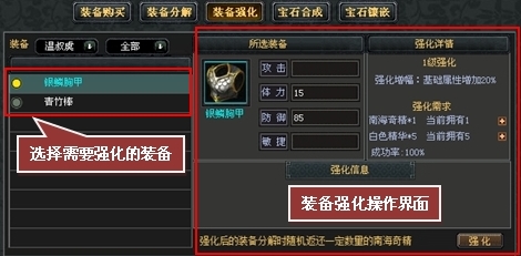 分解完成后,界面右下方会弹出分解装备所得的精华数量,不同品质的装备可获得相应品应的精华,从低到高分别为:白色精华→绿色精华→蓝色精华→紫色精华→橙色精华。 装备强化首先进入铁匠铺,点击“装备强化”的标签页,进入装备强化界面,选中自己需要强化的武器,点击右下角的“强化”按钮,装备强化成功。