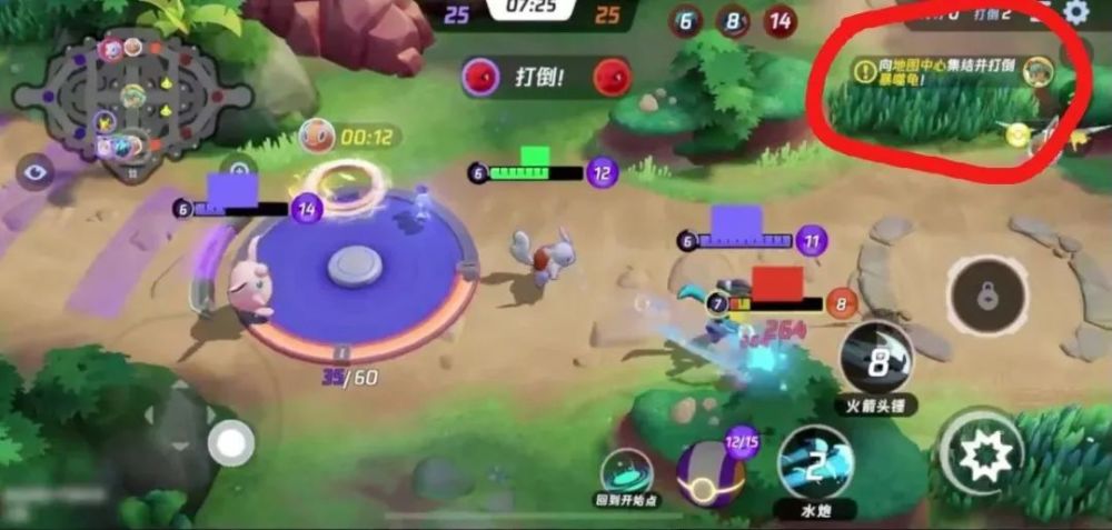 此外,MOBA游戏中常有的“中立资源”,也会出现在《宝可梦大集结》中。当游戏进行到一定时间节点后,地图中的特定位置会刷新出中立资源(比如上图中的暴噬龟),一般需要多名玩家合力才能将其击败,战胜后将会获得可观的收益。