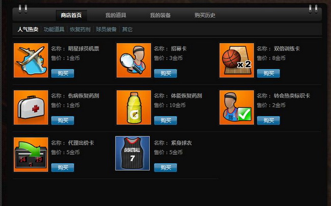 在游戏中,您可以使用您的购买我们的道具,并且装备的到球员身上,而每个道具,都会帮助球员在短期内有所提高,当然,如果您想让自己的球员变得真正强大, 训练和多参加比赛才是真正的王道,以下清单中,是我们目前正在销售的道具装备,不过游戏中真正的顶级装备,您只能在任务模式下打到。