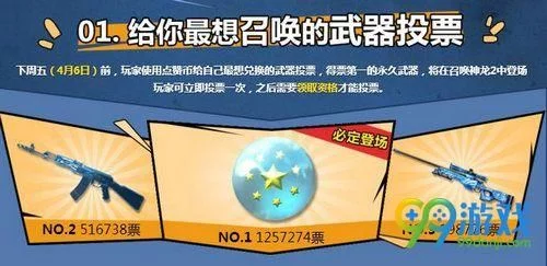 下周五(4月6日)前,玩家使用点赞币给自己最想兑换的武器投票,得票第一的永久武器,将在召唤神龙2中登场