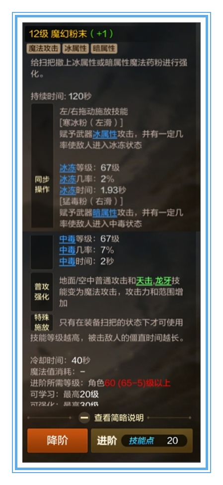 当前版本,魔幻**技能是魔道必须的技能之一(满级消耗240点技能点),不仅选择性赋予武器冰属性或暗属性,同时将魔道的普通攻击和天击、龙牙变为魔法攻击!变为魔法攻击!变为魔法攻击!除了魔道学者的觉醒技能,45级技能冰霜钻孔车绝对是一个集华丽与伤害并重的主力输出技能(满级440点技能点),结合冰属性强化,该技能伤害最大化后甚至可能超过满级的觉醒技能。魔道酸雨云,里云在这里建议,玩家们可以根据自己的喜好进行加点,但是至少加一点,因为他是45级冰霜转空车的前置技能。