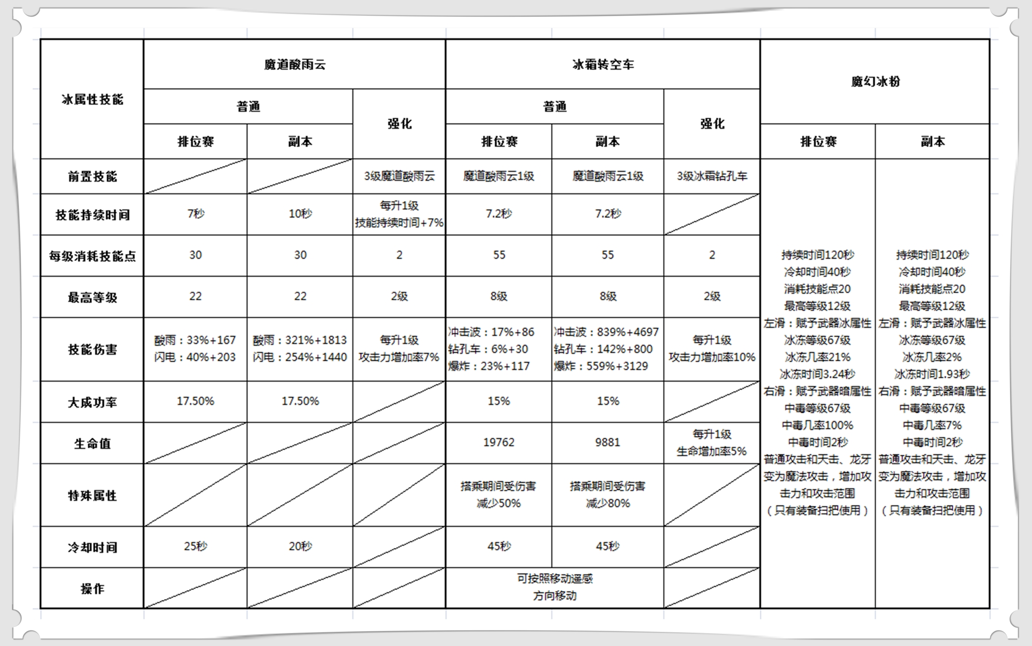 当前版本魔道的冰属性专有技能为魔幻**(辅助性),魔道酸雨云和冰霜钻孔车,详细属性请看下表(图中图中属性为决斗场效果)