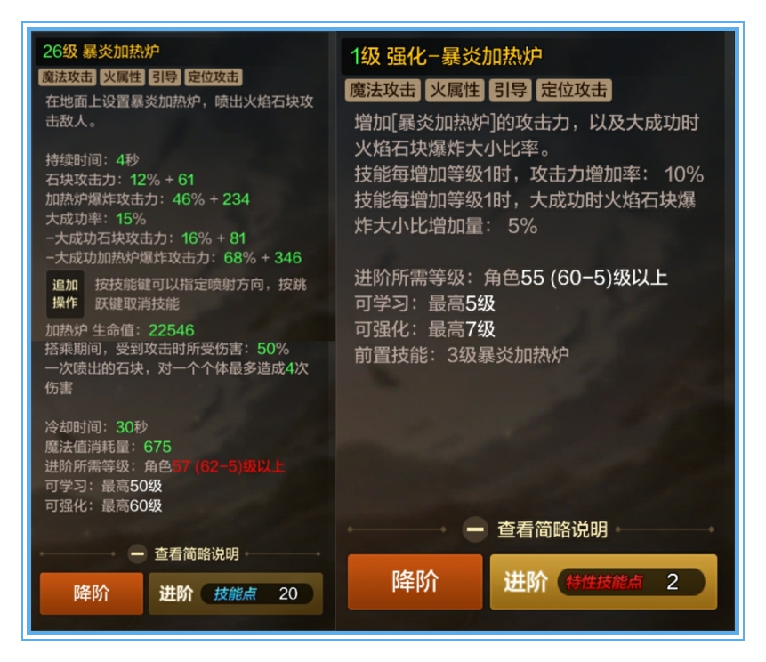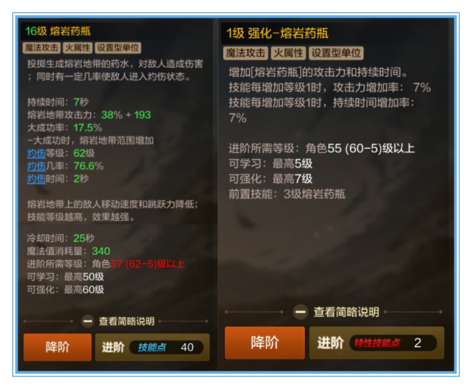 魔道学者专有的火属性技能分为爆炎加热炉和熔岩药瓶,爆炎加热炉在角色等级20级就可以学习了,在前期可以魔道学者的主力输出技能哦;熔岩药瓶在角色等级30级学习,前期必学技能之一,因为是脱手且持续伤害技能,伤害还是不错的。里云在这里建议大家在后期爆炎加热炉可以不学,但是熔岩药瓶还是把他点满哦(满级640点技能点)。