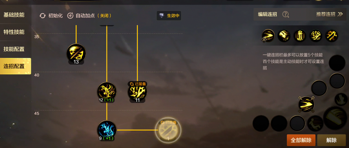 一键连招系统可以最多将5个技能预设为一套连招,在实战中只需要连续按1个技能键就能一次性把连招内的技能快速按出来,节省技能键位的同时,也能极大的提高打击感和连招空间,前期建议大家根据系统的【推荐连招】来预设,后期可以根据自己的手感来设置快速连招。