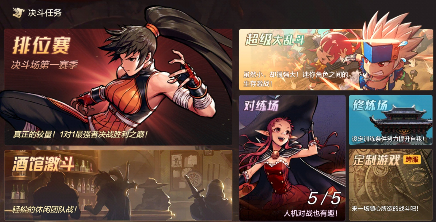 对战内的玩法主要是PVP类型的,但其实除了硬核的1V1连招PK外,也有大乱斗等趣味类型的PK,还有一些则是和电脑进行练习(部分玩法同样有奖励)。
