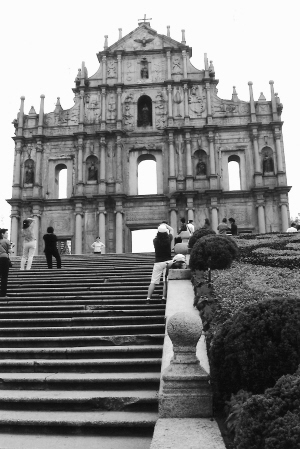 大三巴牌坊下面是宽宽长长的68级石台阶。每次记者来到大三巴,无论是自下而上还是自上而下,都要反反复复地在台阶上走上几个来回,从各个不同的角度细细瞻仰大三巴,欣赏它的宏伟壮丽,品味它的历史沧桑。