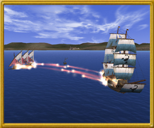 击沉NPC的船,习惯战斗。在海上会有NPC的船在航行。必要的先决条件就是要习惯这种战斗模式。在一开始的时候,可以目标攻击没有显示任何特定国籍的「地方海贼」。只要敌船的耐久度或是敌方船员变成O,就能取得胜利,也可以获得金钱,有时候甚至还可以得到交易品或是道具物品等。此外,若是战斗获胜的话,战斗等级的经验值或战斗名声也会跟著提升。 |