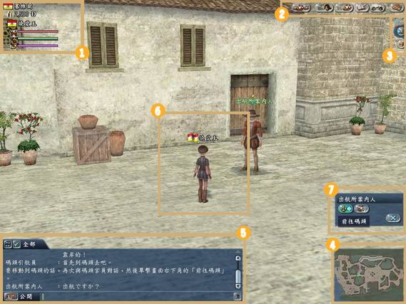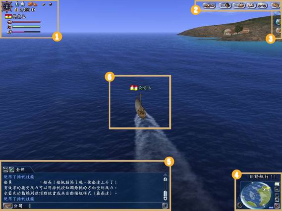 | 显示的资料有,所在场所名称与其所属国旗织、身上金钱、人物名称,三长条状分别表示(船耐久度)、(船员数、疲劳度)与(行动力)。滑鼠移过图上会显示其详细。 |