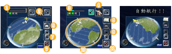 | 到达海上後点击(6)的话可以张开帆布。之後一边看(10)风向一边按(2)可以让帆布有效率地调整到最佳的受风角度。确实做的话就会延伸一格水蓝色风量表(1),当量表到达最大的话就会在一定时间内变为「自动航行」状态罗。当变成自动航行之後,之後只要进行航路方向操作就可以了。 |