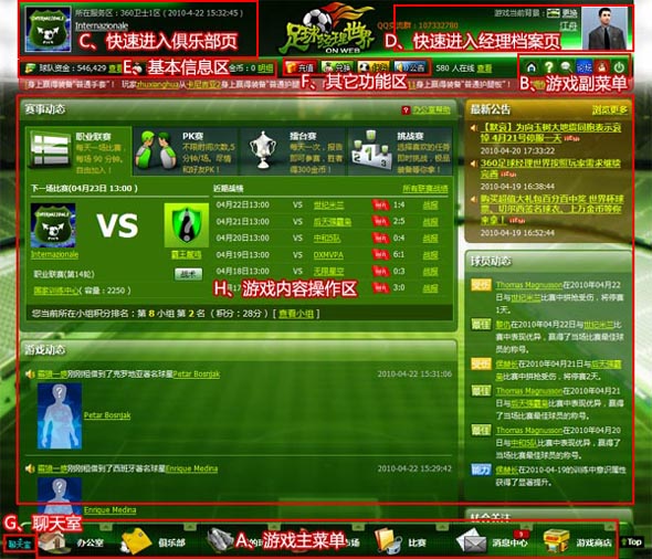 H) 游戏内容操作区:这里是您每天进行管理和浏览的主要区域。 |
