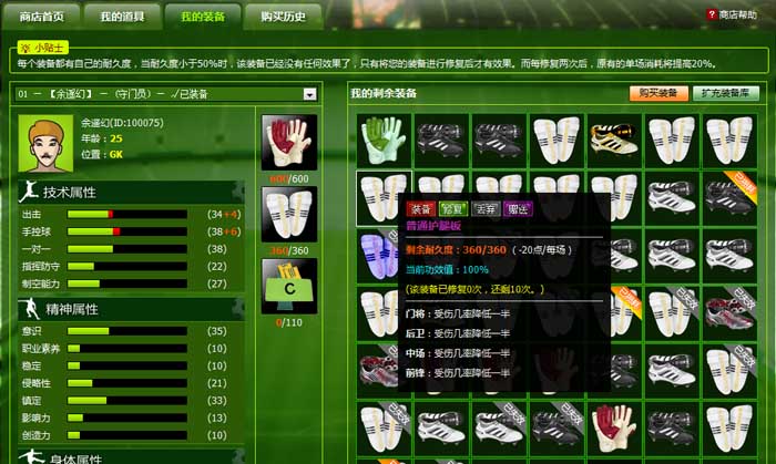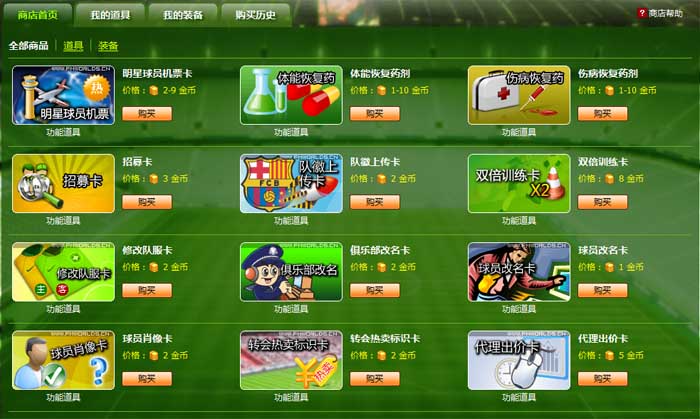 在游戏中,您可以使用您的购买我们的道具,并且装备的到球员身上,而每个道具,都会帮助球员在短期内有所提高,当然,如果您想让自己的球员变得真正强大, 训练和多参加比赛才是真正的王道,以下清单中,是我们目前正在销售的道具装备,不过游戏中真正的顶级装备,您只能在任务模式下打到。