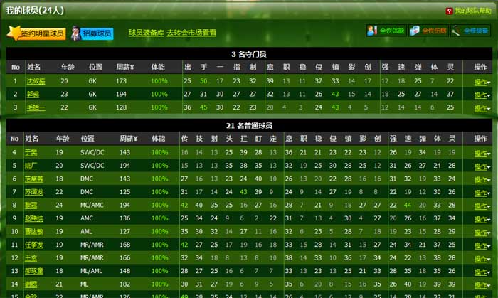 默认有24名球员,其它包括3名守门员和21名普通球员。目前每名球员属性的上限为100,当然,您可以通过训练、比赛、以及装备道具的方式让您的球员属性不断攀升。