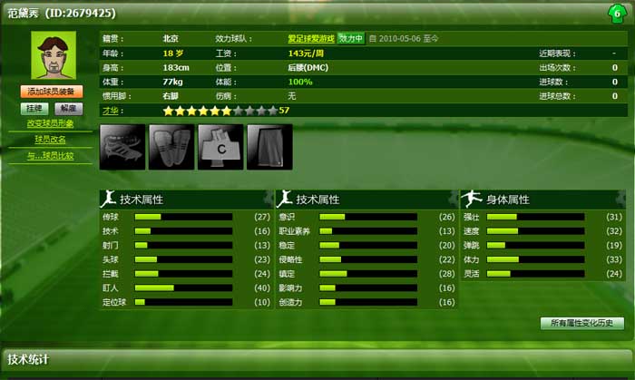 球员资料页中包括球员的形像头像、以及详细的资料和统计资料。