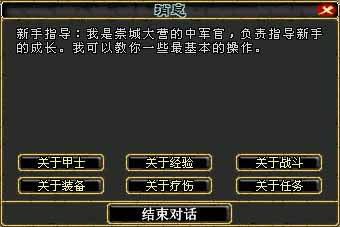 1. 第一次进入游戏世界,会自动弹出一个与角色相对应的新手指引,通过它,玩家可以了解到游戏中一些基本的操作和信息。也可以关 闭。之后通过找NPC“新手指导”“高手进阶”来获取这方面的信息。当然通过“F1帮助”也能获得相当多的有用信息。