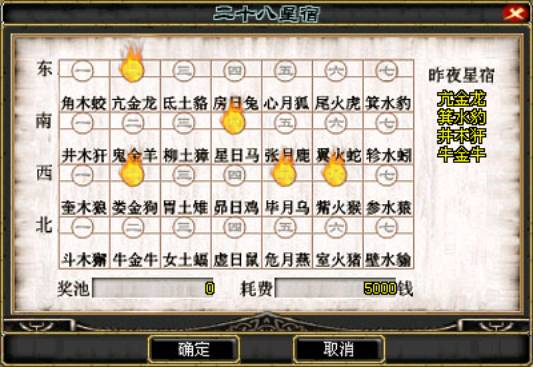传说自上古开始,九天之上就有了二十八星宿,他们每天都会有四人轮流注视着九天之下的九州之地。并且会在每天的戌时(每晚8点)出现在天际,供人们祈福。如果你是有缘人的话,能预先知道这四位星宿的名字,你还能得到这四位星宿的眷顾。前往西岐朝歌可在星官那里用金钱换取一张符简,你只需要根据你的意愿点出你认为今晚戌时会出现的四位星宿的名字就可以了。然后等晚上8点钟的时候看看自己是否猜对了。