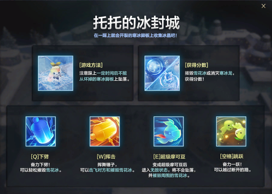 ●E技能为【超级摩可豆】,变成超级摩可豆后,进入无敌状态,将不会坠落,并摧毁周围的雪花冰。