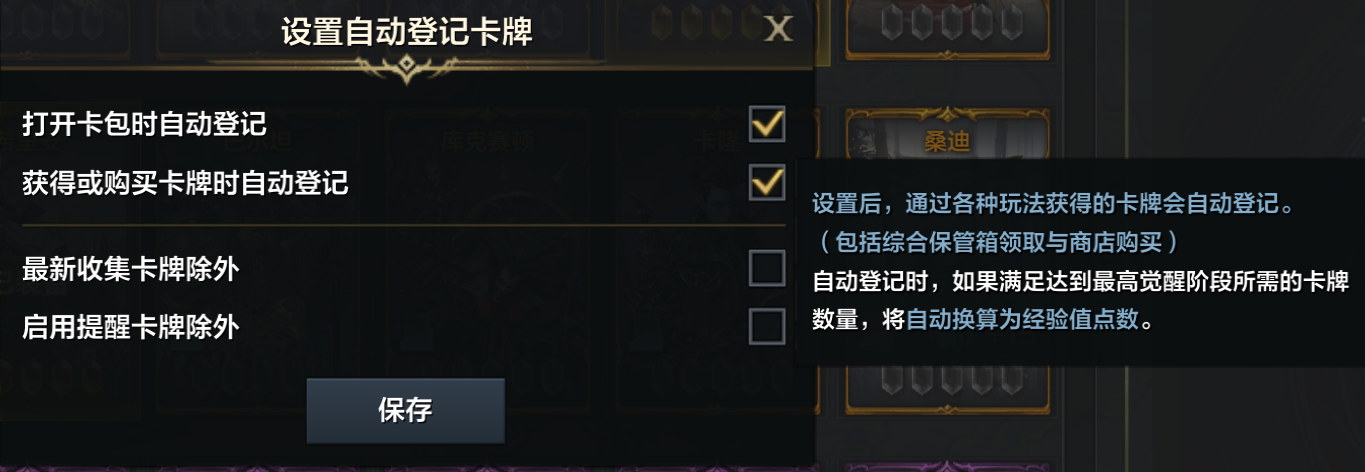 ●通过商店购买、副本掉落(无法登记卡牌的区域除外)、综合保管箱获得的卡牌可以自动登记。