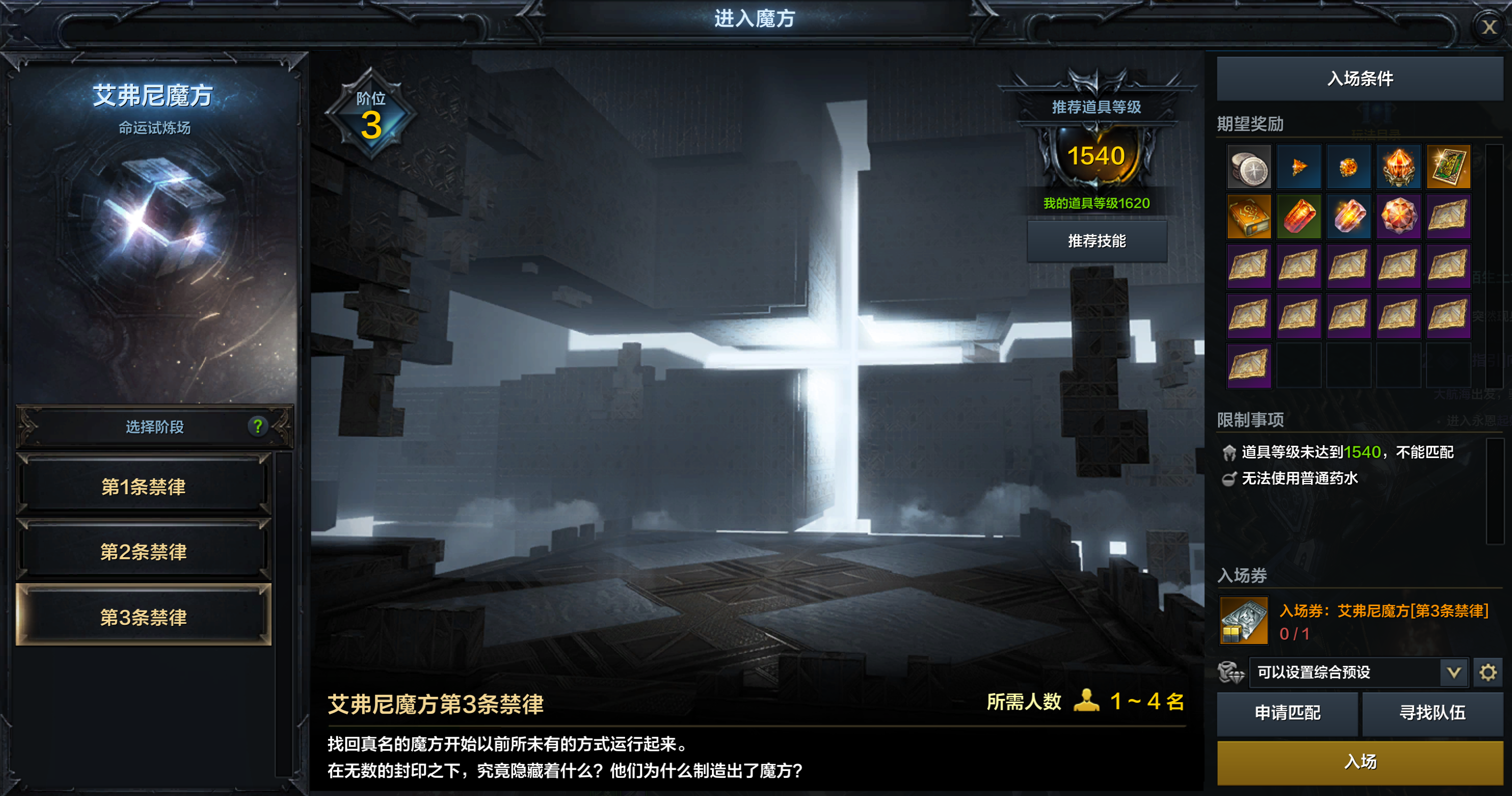●道具等级到达1540时即可挑战,冒险家进入需要消耗【入场券:艾弗尼魔方[第3条禁律]】。