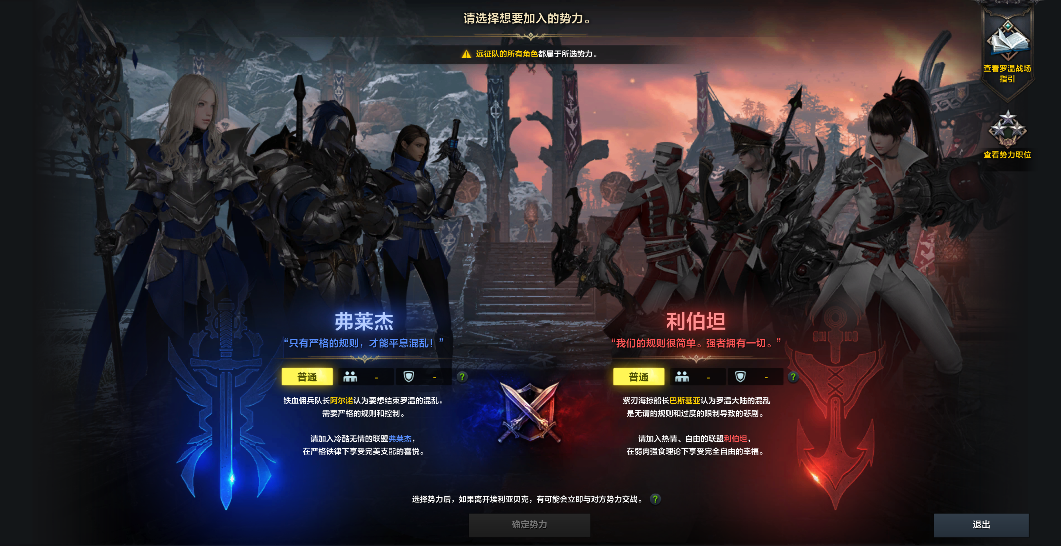 大陆特色:包含两个势力【利伯坦】和【弗莱杰】,冒险家在完成主线剧情后,可以选择一个阵营加入。