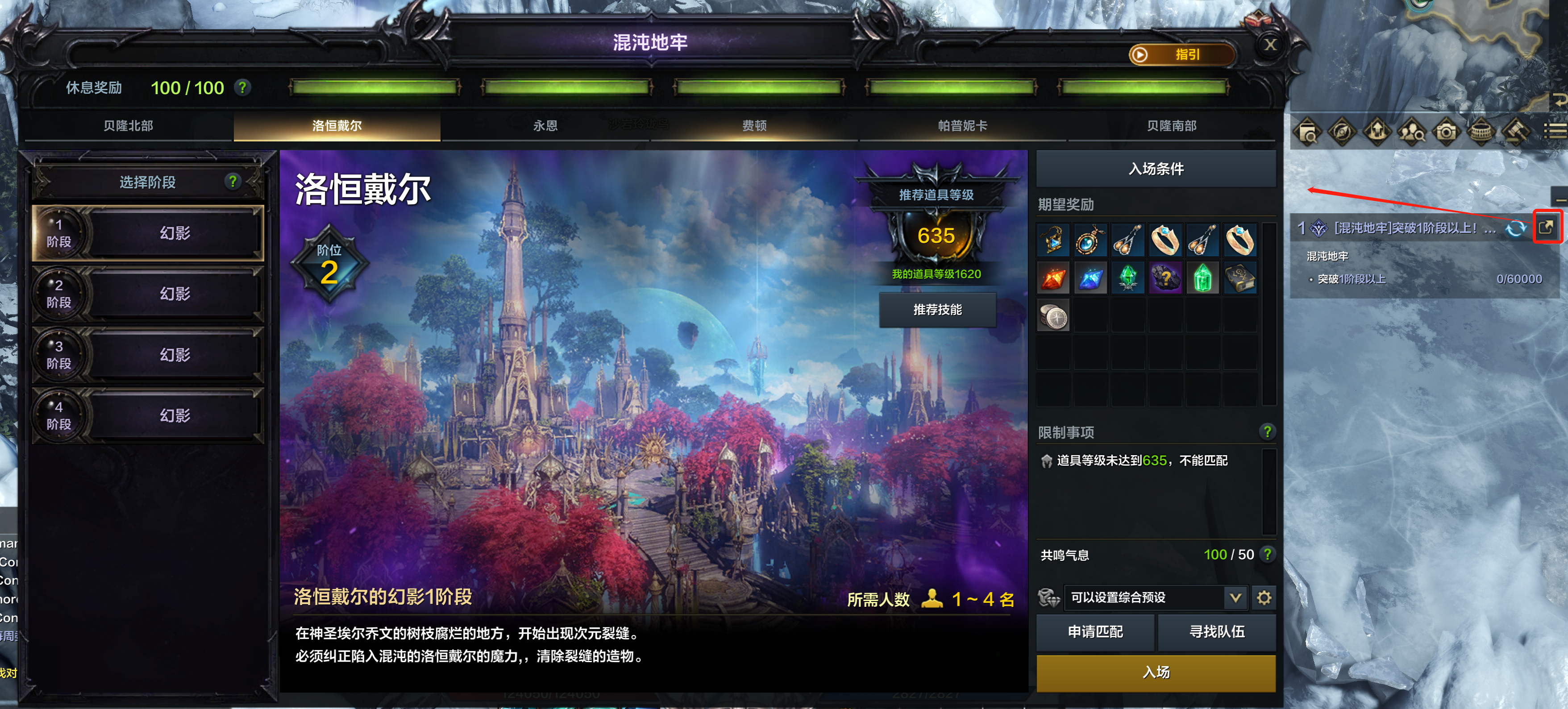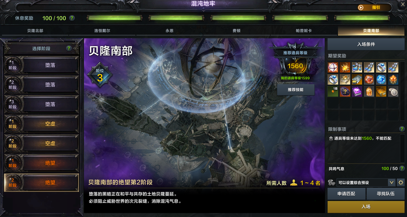 ●道具等级到达1540时可挑战贝隆南部绝望1阶段
