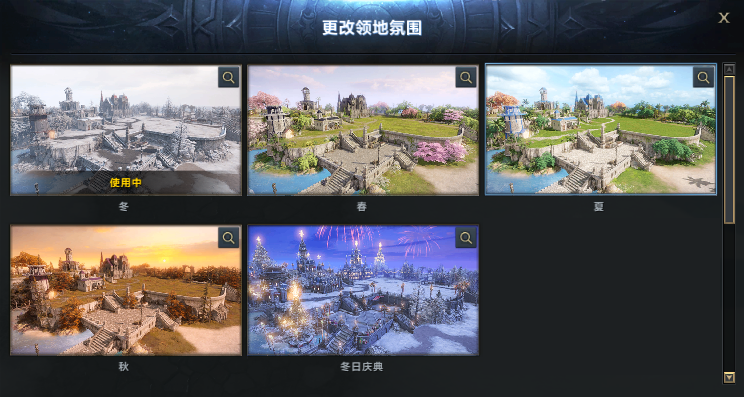●冒险家可以切换领地的基础建筑和植被的风格,默认领地氛围有春、夏、秋三种场景。